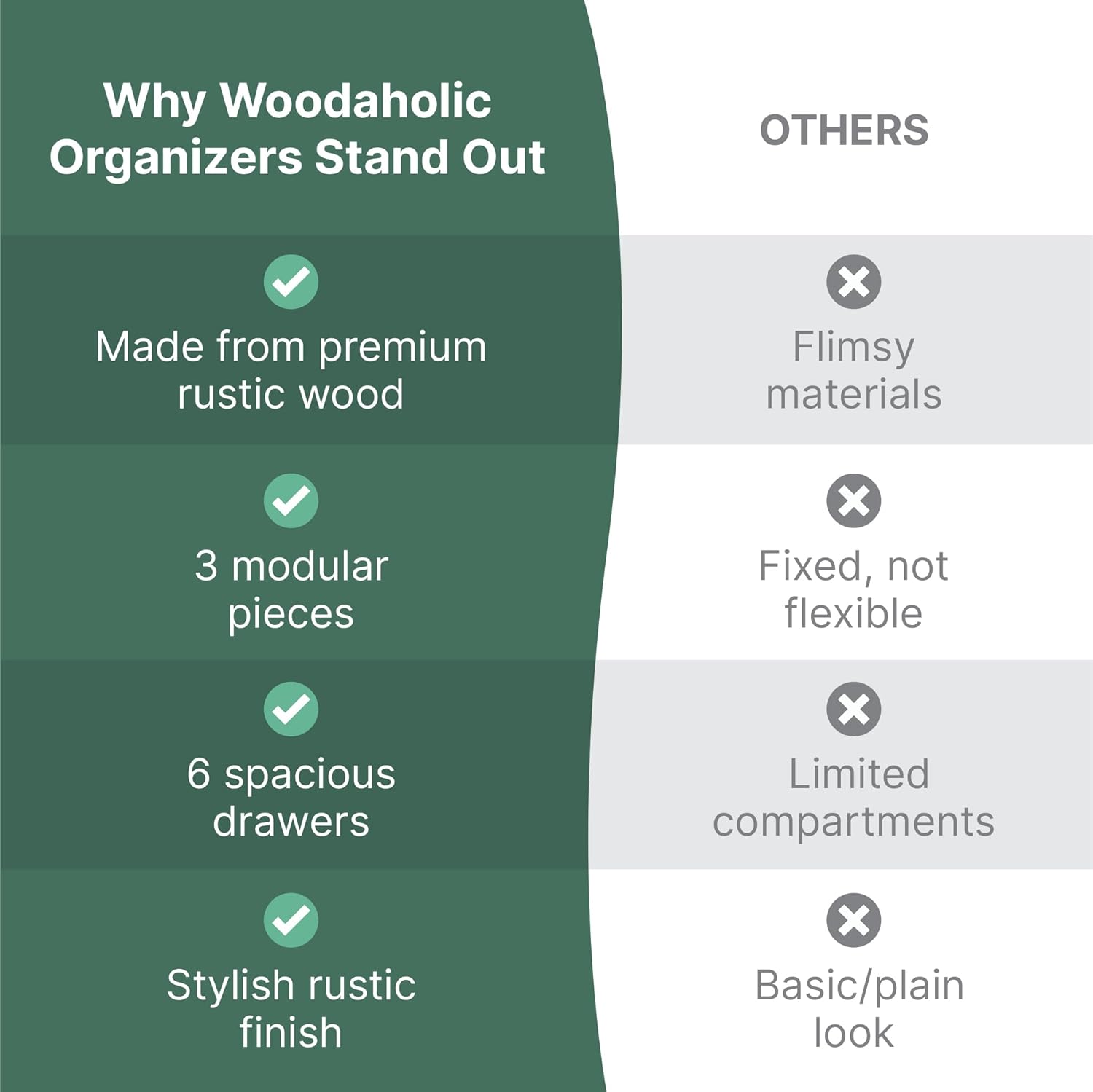 • Apothecary-Inspired Wooden Aesthetic: Vintage drawer styling inspired by apothecary cabinets and classic card catalog storage systems.