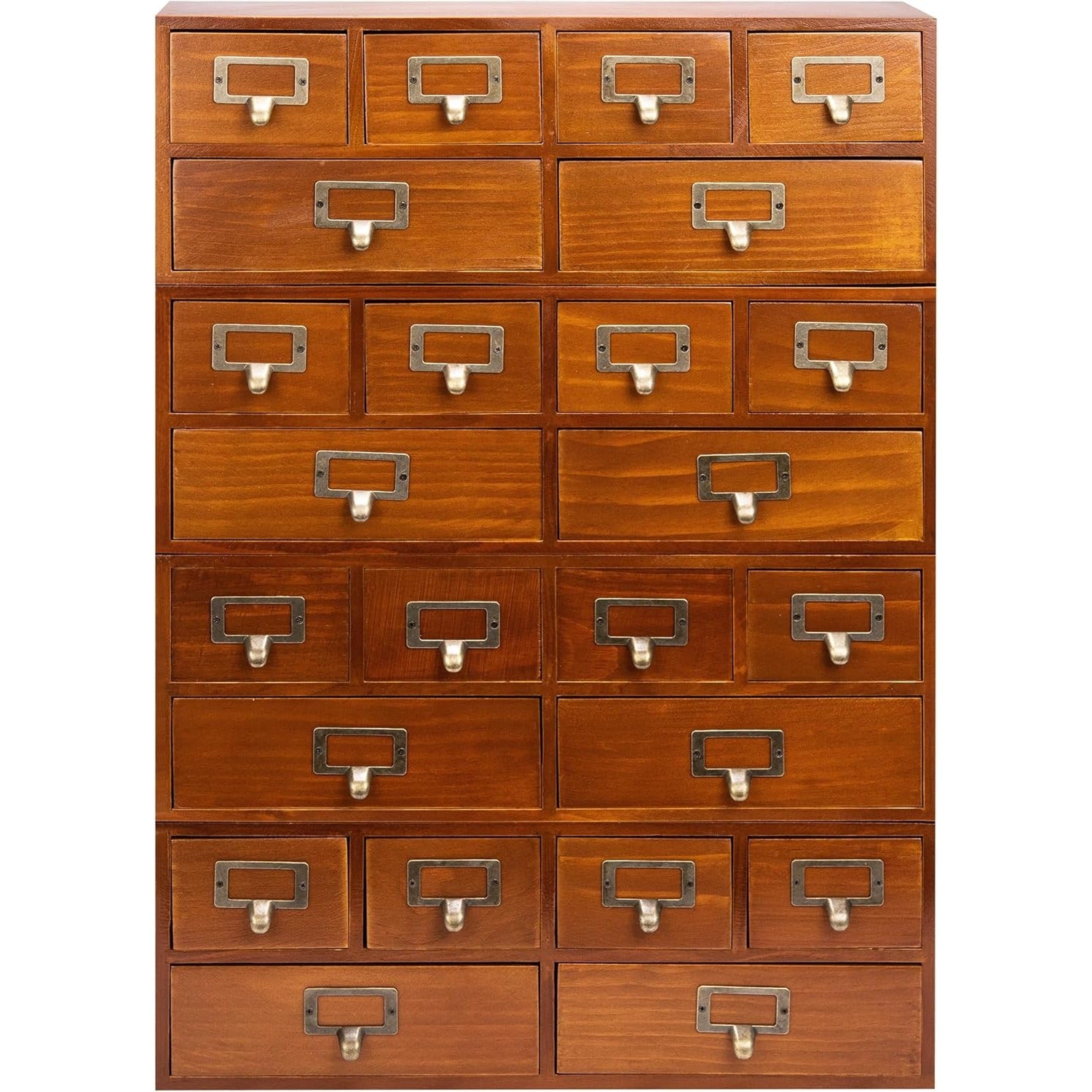 Enhance your workspace with the Woodaholic Vintage Wooden Desk Organizer, the ultimate solution for decluttering and elevating your space. This set of four stackable organizing cabinets, crafted from high-quality solid wood and finished in a timeless mahogany brown, offers robust and sustainable storage. Each unit comes with six smooth-sliding drawers, fitted with elegant steel handles and practical label holders, making it effortless to organize everything from office supplies to kitchen tools.